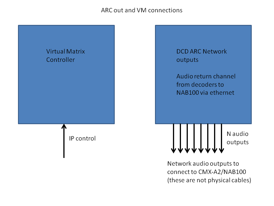 DCD ARC Network outputs can be connected to CMX-A2/NAB100 driver to support audio return channel via network. Connect the first 8 Network audio outputs to the 8 Network (phy) inputs on the CMX-A2/NAB driver. This is not needed if you do not have CMX-A2/NAB in the project. ARC can also be routed to any decoder audio output (in particular the VTX100 audio outputs) to support ARC in systems without CMX-A2/NAB. In that case, just hook the proper decoder audio output to your audio matrix/amp.