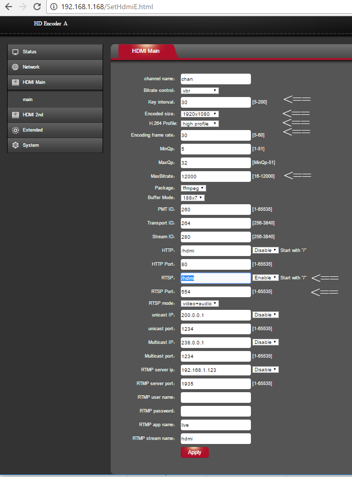 The important parameters are marked with the "<==" indicator. You should find corresponding settings and set them to match as shown above.