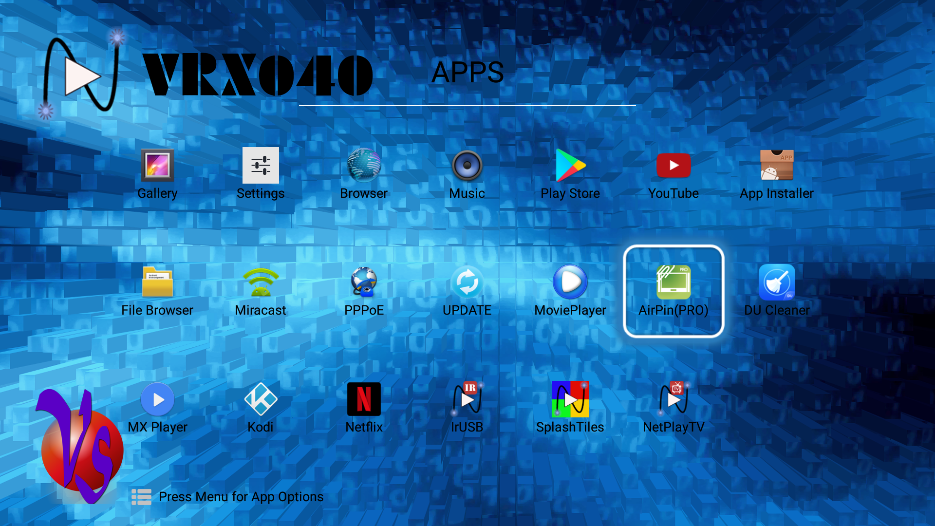 To enable AirPlay on VRX040, first start the "AirPin" app: